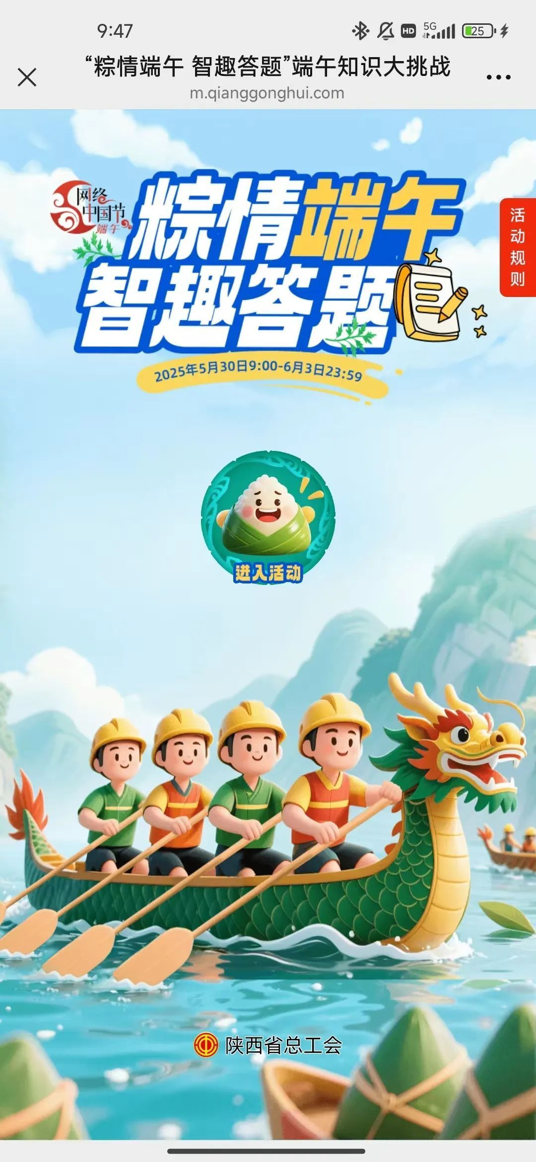 方法三:登录“职工之家”APP,点击“矩阵”进入“陕西”专区,点击“粽情端午 智趣答题”端午知识大挑战banner可参与活动。