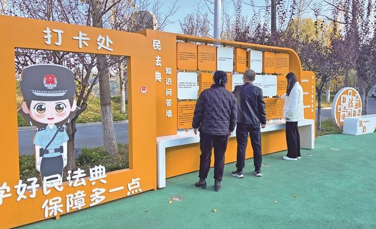 在铜川市王益区南屏公园法治文化广场,亮眼的橙色法治宣传墙格外醒目,“学好民法典 保障多一点”的标语通俗易懂;“民法典知识问答墙”上,一块块展板有序排列,市民或驻足凝视、或交流答题……