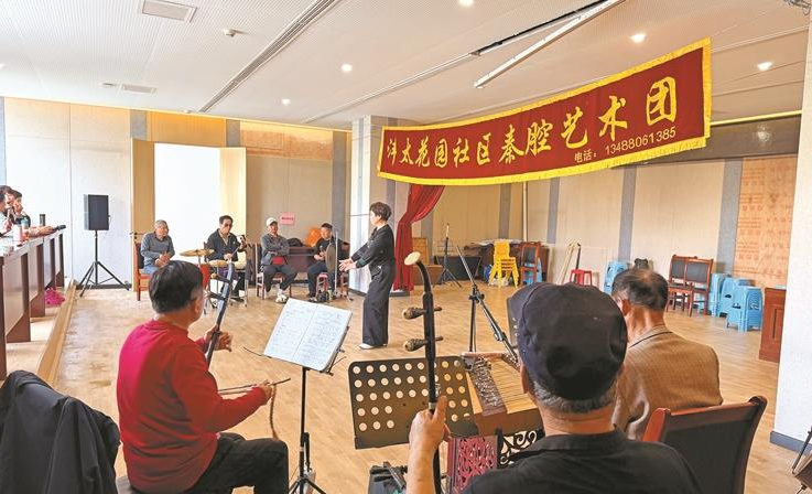 4月2日,沣太花园社区党群服务中心活动室里,社区秦腔艺术团成员在排练节目。 记者 席晨摄